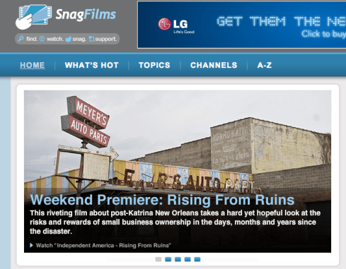 It’s funny how pleased I am that I face yet another high-profile opportunity to have people watch the content that I create for free. Snagfilms.com is currently featuring Independent America: Rising from Ruins on its homepage, and will distribute it through a number of other channels, including Hulu and hopefully Netflix at some point (my first film “The Two-Lane Search for Mom & Pop” is already on Hulu, and is heading for iTunes). Sure, you can still push for more money via a broadcast TV license, but at least as an indie filmmaker, those are getting harder to find, and they’re paying less. So we content ourselves with the “digital pennies” as the “analog dollars” slip away, with the sheer hope that online, multiple-channel exposure leads to benefits in other ways (i.e. keep your day job, build your own personal brand).