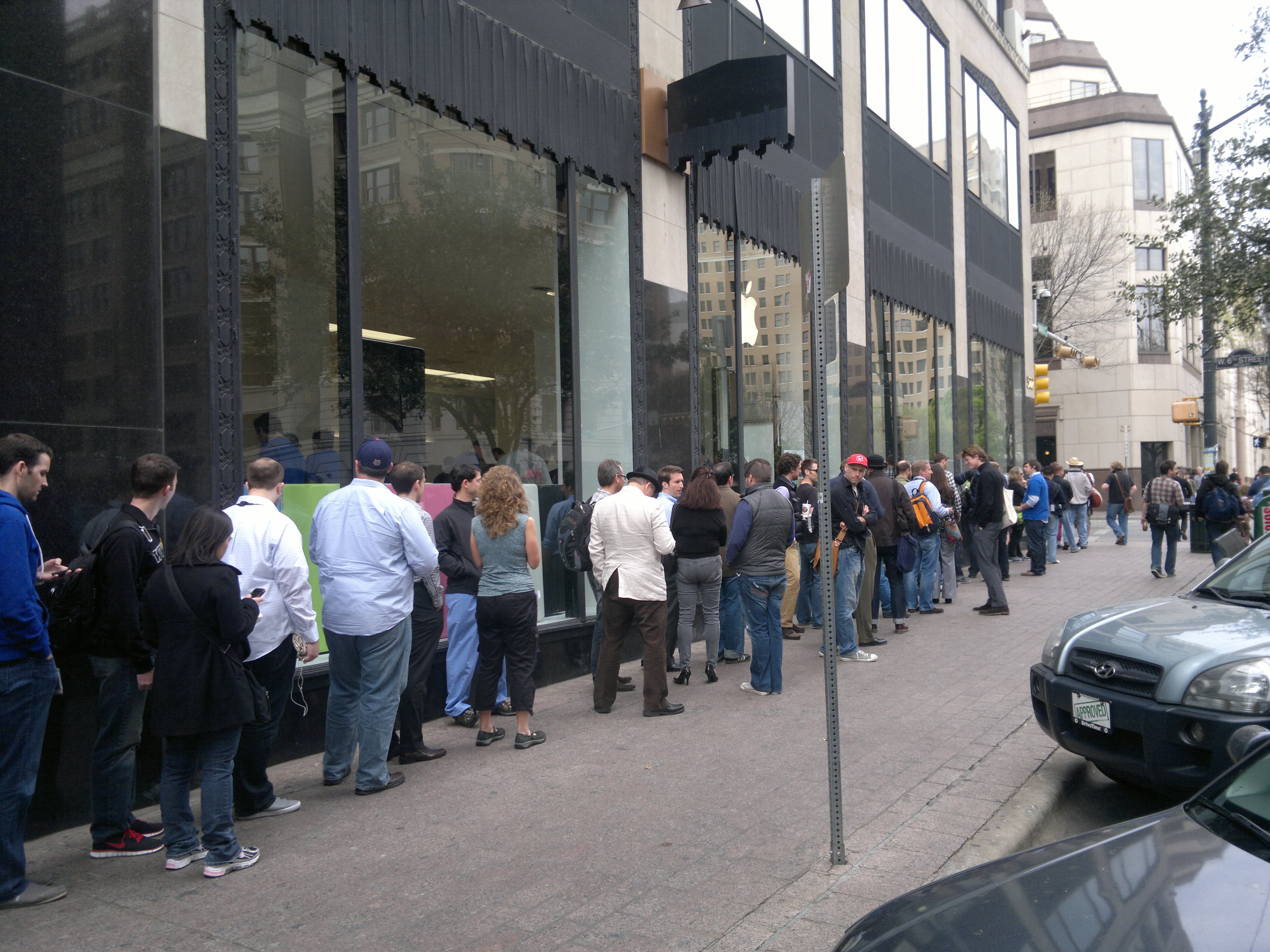 Thinking I had stumbled upon another theater, I rushed ahead — only to see a gaggle of blue t-shirted young folk guarding the entrance. I had discovered the makeshift Apple Store, announced at the outset of SXSW, housed in the same downtown building as Gold’s Gym. These people were lined up to get their iPad 2, which had just been released in the past twenty-four hours.