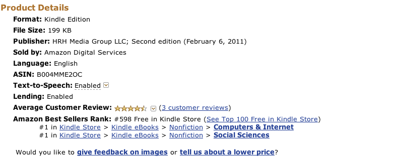 What does Amazon get out of giving away my book for free? Well authors such as me just add to the utility of the Kindle. It brings more customers to their site, to purchase their devices, to browse other items for sale. My content is the lure to a deeper, potentially sustainable relationship between customer and retailer. And my book ended up hitting #1 in both the “Social Sciences” and “Computer & Internet” categories, peaking at #249 in the top “free” Kindle books for a brief shining moment (it’s hard for “free” to compete with so much other “free!”).