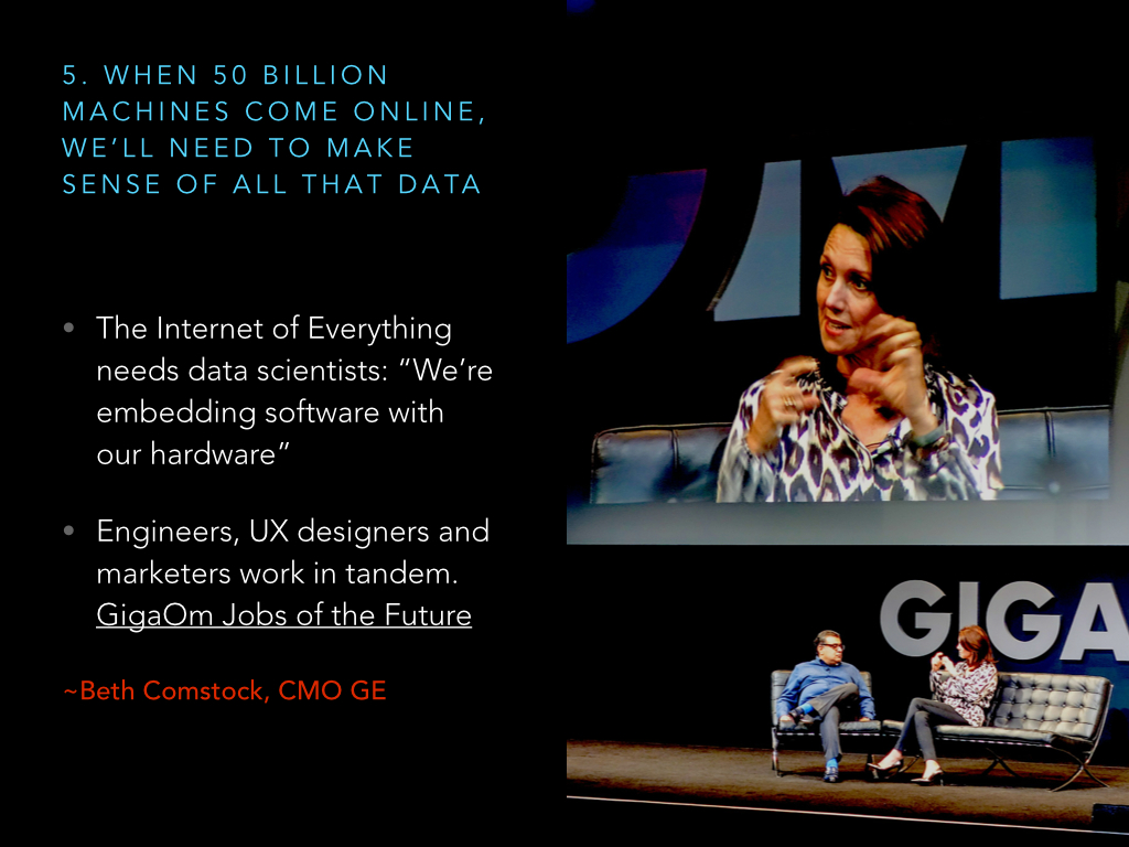 It’s about to explode as 50 billion machines come online in the near future (according to GE CMO Beth Comstock, see 10 new tech-related thoughts I must share after my trip to San Francisco). Marketing, PR, whatever will no longer the be icing on the cake (or an expendable expenditure), but rather an essential first step in tandem with research, product development, ideation, whatever. That’s because the feedback loop with the user will be crucial to design of these once inanimate objects that now are in perpetual communication with the user, and other organizations. Professional communicators will not only serve as the guiding strategists between the hardware’s interface and the user, but they will also play the role of translator and internal agents of transformation for an organization replete with UX designers and engineers.